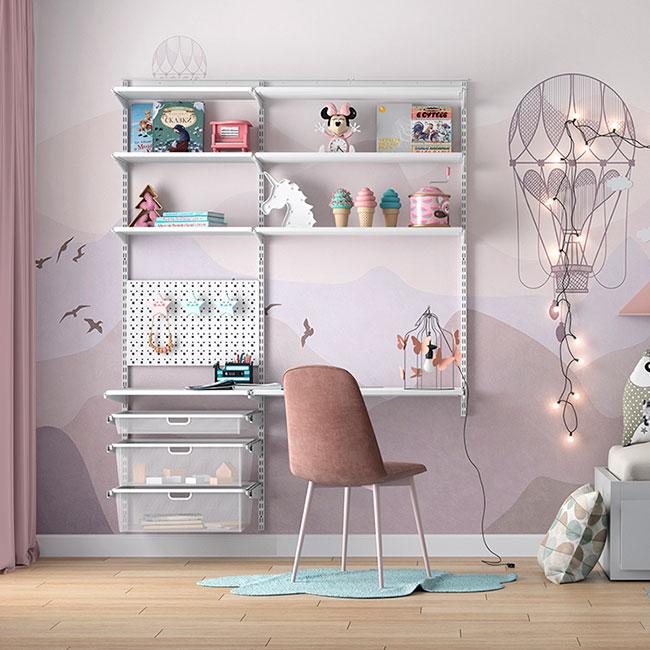 Модульная конструкция позволяет легко менять расположение полок, корзин и штанг, подстраивая их под рост и интересы — от хранения игрушек и книг до одежды и учебных принадлежностей.