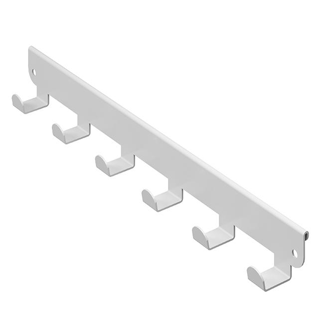 Конструкция представляет собой металлическую планку с 6 или 8 крючками (в зависимости от модели), которая навешивается на внешнюю боковую поверхность кронштейна в гардеробной системе ПРАКТИК HOME.